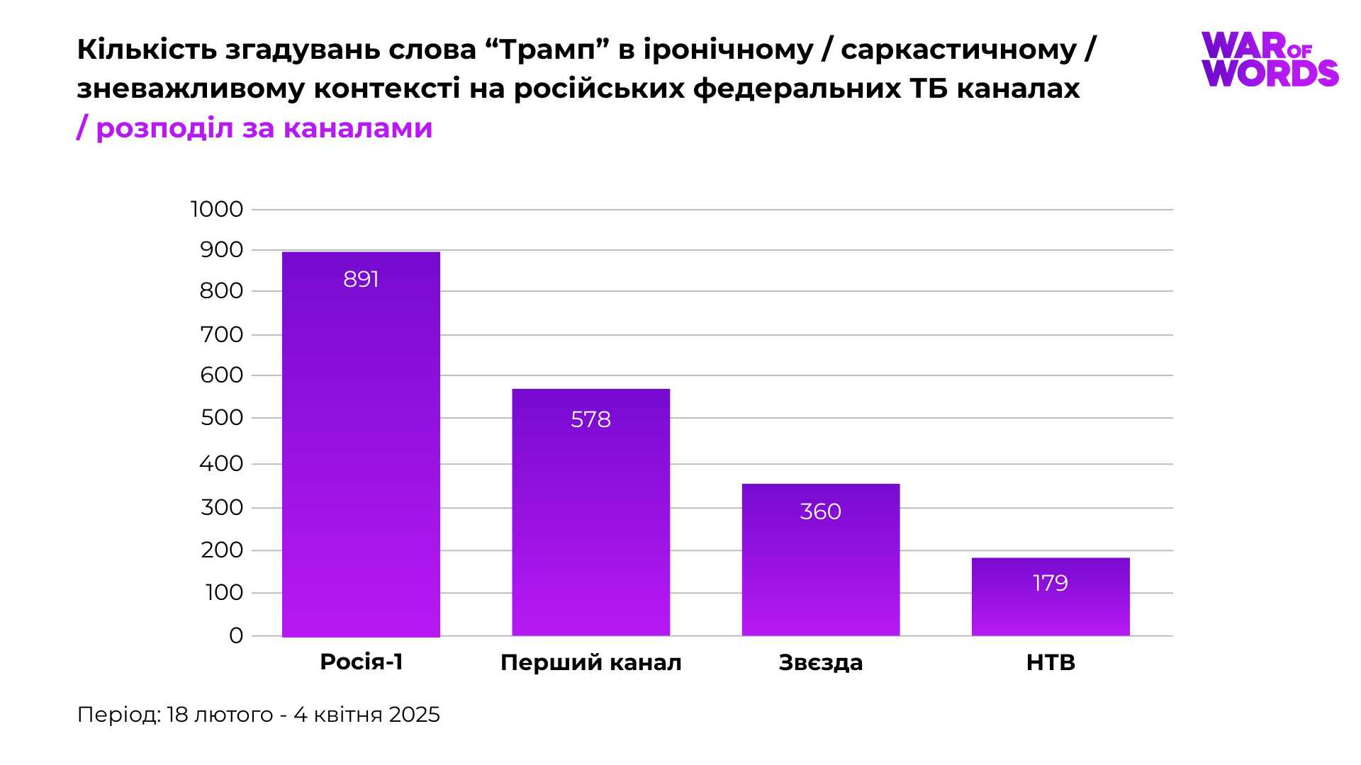 По их подсчетам, в период с 18 февраля по 4 апреля на ключевых российских телеканалах было около 14 тысяч упоминаний со словом «Трамп». Каждое седьмое упоминание Трампа было с сарказмом, насмешкой или пренебрежением. За полтора месяца это произошло 2009 раз, то есть в среднем 43 раза в день.