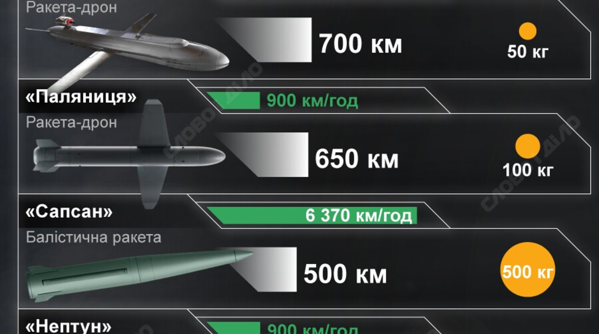 Украинская крылатая ракета «Фламинго» превзошла все предыдущие разработки отечественного ОПК в характеристиках дальности полета (3 000 км) и веса боевой части (1 000 кг). Чуть меньше дальность новой ракеты с неофициальным названием «Длинный Нептун» – 1 000 км. В то же время баллистическая ракета «Сапсан» обладает максимальной скоростью среди всех разработанных с начала вторжения ракет – 6 370 км/ч. «Слово и дело» решило сравнить дальность, максимальную скорость и вес боевой части новых украинских ракет, уже успешно применяемых на фронте и в тылу врага.