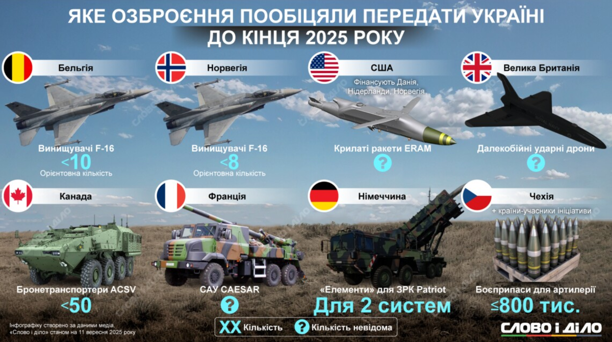 В течение последних четырех месяцев этого года Украина может значительно усилить свой военный потенциал, если получит обещанное союзниками вооружение. Кроме артиллерийских снарядов по чешской инициативе, на вооружение ВСУ могут поступить истребители F-16 от Бельгии и Норвегии, оборудование к ЗРК Patriot от Германии, крылатые ракеты ERAM от США, дальнобойные дроны от Британии, а также самоходные гаубицы. Подробнее об обещанном вооружении для Украины до конца 2025 года – на инфографике.