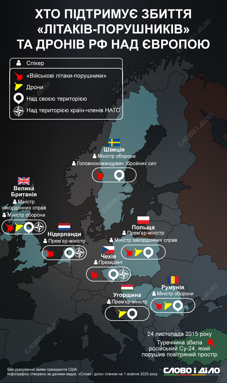 Ряд европейских стран заявил о готовности сбивать «неизвестные» дроны или самолеты-нарушители воздушного пространства, как это сделала в ноябре 2015 года Турция. Тогда турецкие истребители F-16 сбили военный самолет рф вблизи сирийской границы после того, как он нарушил воздушное пространство страны в течение пяти минут и не отреагировал на многочисленные предупреждения. В то же время россия настаивала, что самолет все время находился над территорией Сирии. На фоне инцидентов с дронами в небе Европы и пролетами истребителей рф, «Слово и дело» решили посмотреть, кто поддерживает сбитие беспилотников и военных самолетов над Европой в случае нарушения воздушного пространства.