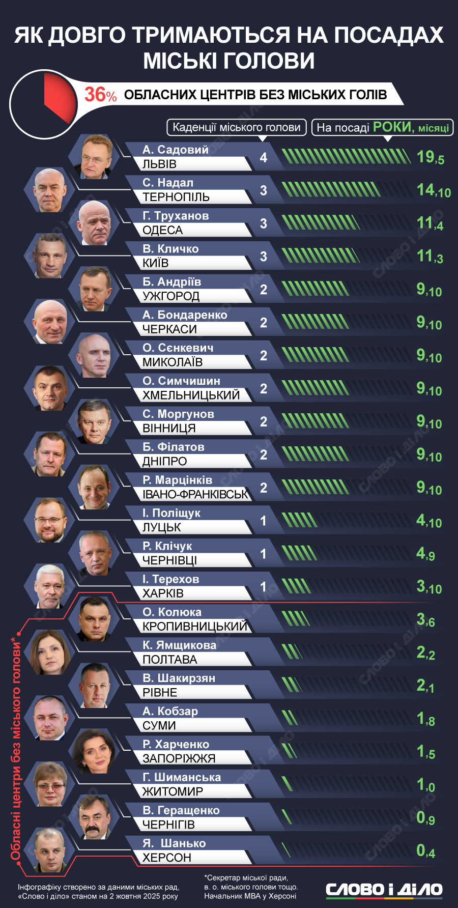 Глава Львова Андрей Садовый занимает должность городского головы уже почти 19 с половиной лет – это дольше всех мэров в Украине. Наименьший срок в должности городского головы пока проработал глава Харькова Игорь Терехов – три года и десять месяцев. В то же время восемь областных центров остаются без мэра, городами руководят заместители, секретари или начальники ГВА. При этом ЦИК сообщала, что местные выборы в октябре 2025 года не будут проводиться из-за военного положения и отсутствия решения парламента. «Слово и дело» решило посмотреть, сколько лет занимают должность действующие городские головы в Украине.