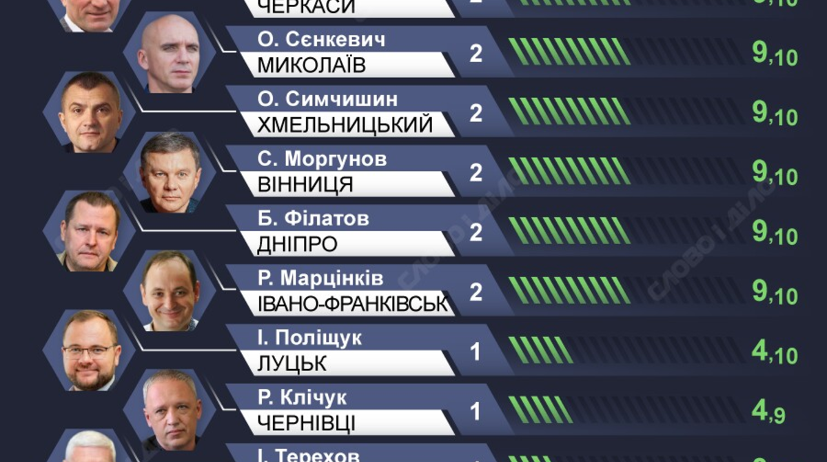 Одинаковый срок в должности городского головы провели: мэр Ужгорода Богдан Андреев, мэр Черкасс Анатолий Бондаренко, мэр Николаева Александр Сенкевич, мэр Хмельницкого Александр Симчишин, мэр Винницы Сергей Моргунов, мэр Днепра** Борис Филатов**, мэр Ивано-Франковска Руслан Марцинкив – 9 лет и 10 месяцев (вторая каденция)