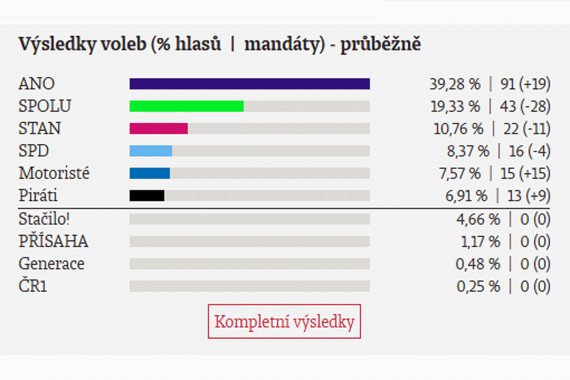 Напомним, 3 октября в Чехии стартовали парламентские выборы, они продолжались два дня. Чехи выбирали 200 депутатов нижней палаты парламента (Палаты депутатов) по пропорциональной избирательной системе сроком четыре года. Чтобы преодолеть проходной барьер, партия должна набрать не менее 5% голосов.