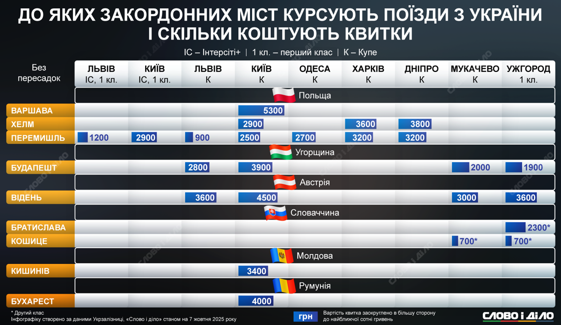С 10 октября из Украины будет курсировать новый поезд международного сообщения по маршруту Киев–Бухарест. Рейс будет выполняться ежедневно и проходить через Киев, Винницу, Жмеринку, Могилев-Подольский, Велчинец, Унгены, Яссы и столицу Румынии. А с 12 сентября Укрзализныця запустила из Ужгорода первые поезда евроколией в столицы Европейского Союза – Братиславу, Будапешт и Вену. «Слово и дело» на инфографике решило показать, из каких украинских городов и в какие зарубежные страны курсируют без пересадки поезда УЗ и сколько будет стоить билет.