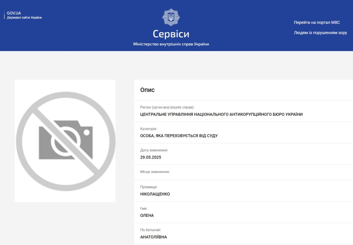 «Рассмотрение уголовного производства по обвинению (Николащенко – ред.) в совершении уголовного правонарушения (преступления), предусмотренного ч.3 ст. 368 УК Украины приостановить. Объявить розыск обвиняемой. Проведение розыска поручить Национальному антикоррупционному бюро Украины. Организацию выполнения решения о розыске поручить прокурору САП», – говорится в решении.