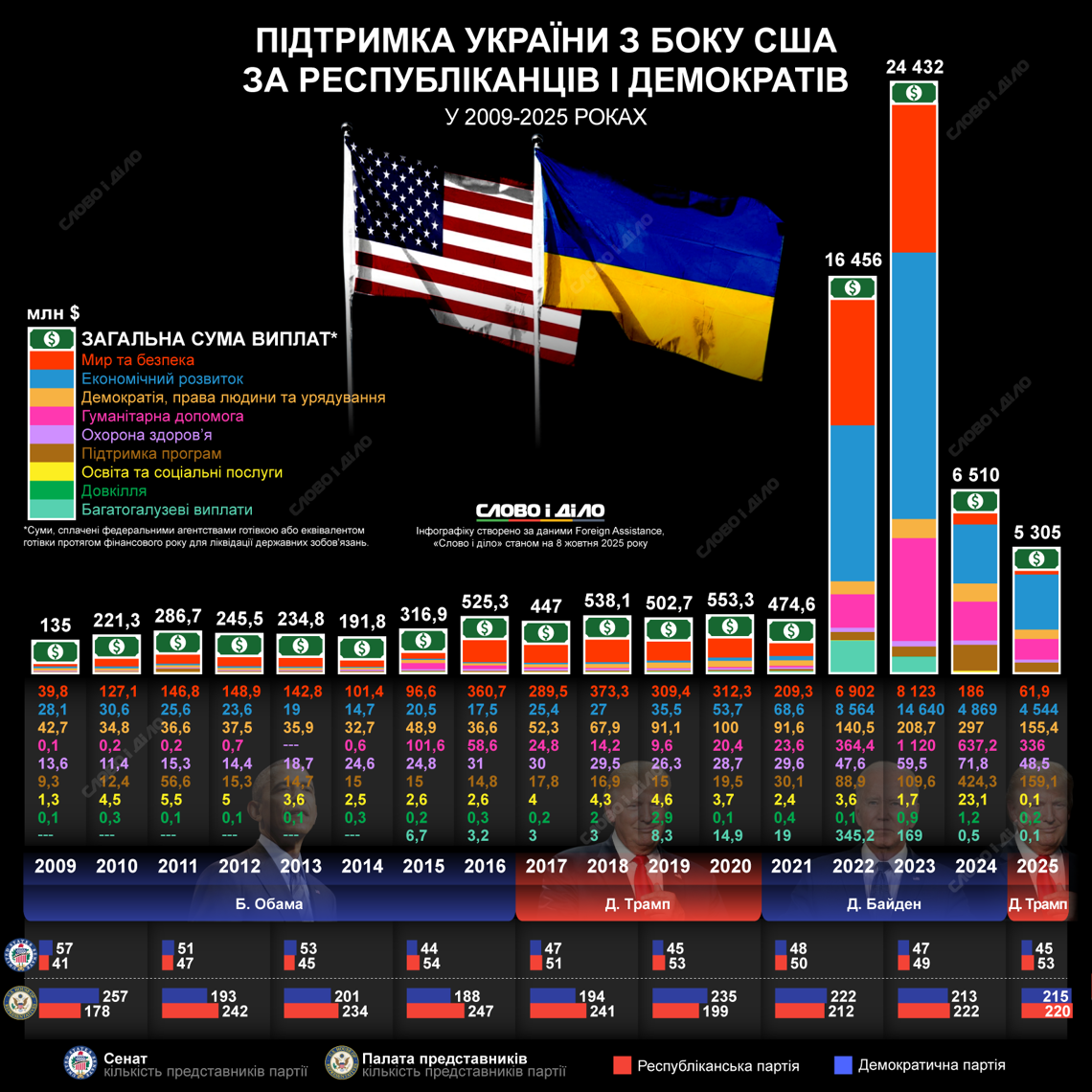 Поддержка Украины со стороны США не прекратилась в текущем году во время второй каденции республиканца Дональда Трампа, хотя изменилась ее ориентированность – с военной на экономическую. Летом в Белом доме заявили, что больше не будут давать Украине деньги на войну, а поставки вооружения должны финансировать европейские страны. Тогда была создана и заработала инициатива PURL. В то же время, рекордными за последние 16 лет были выплаты от США во времена президентства демократа Джо Байдена, а именно в 2023-м – на второй год полномасштабного вторжения россии. Также Белый дом оказывал поддержку Украине и во времена правления президента-демократа Барака Обамы. На инфографике «Слово и дело» – как менялась поддержка Украины со стороны США при республиканцах и демократах с 2009 по 2025 год.