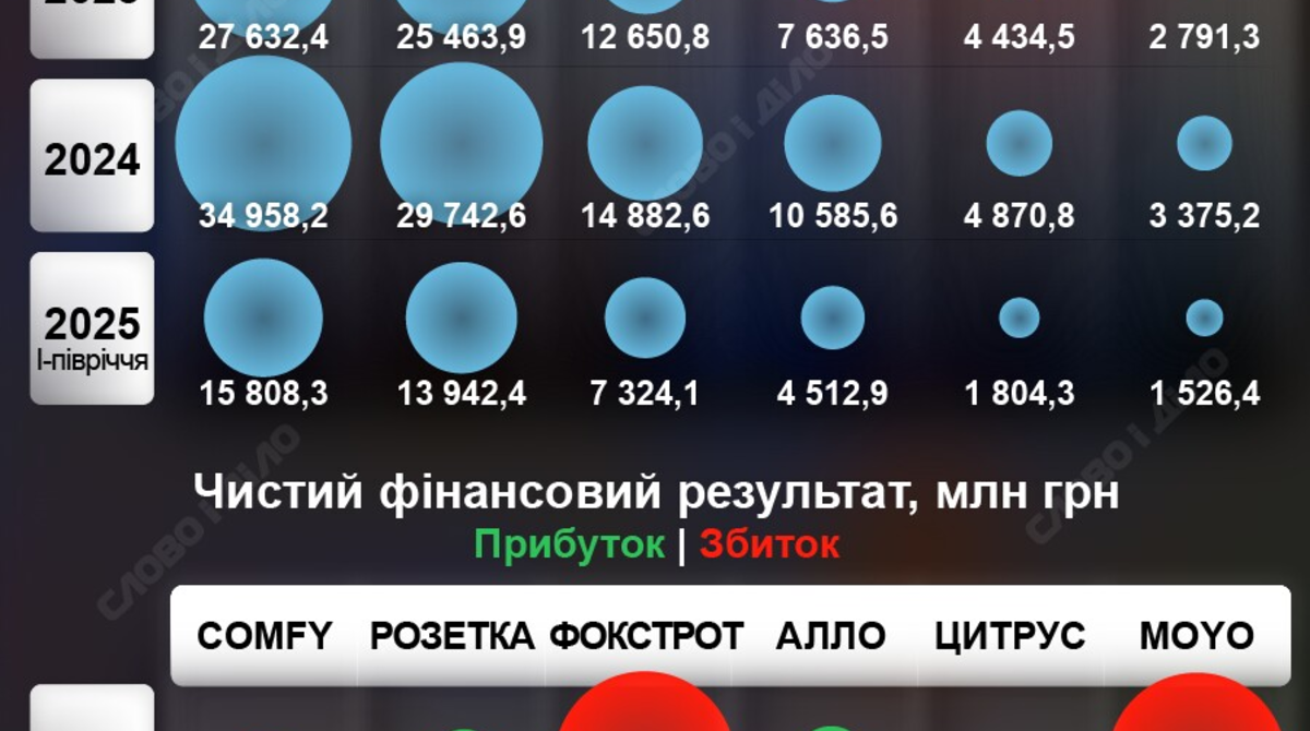 За первое полугодие 2025 года самый большой доход в отчетах указали Сomfy и «Розетка». Однако, если верить данным из отчетов, пока эти магазины, а также «Фокстрот» и Moyo работают «в минус». О наибольших убытках в этом году заявил Сomfy (-93,6 млн грн). Прибыль с начала года внесли в свои отчеты только «Алло» (20,7 млн грн) и «Цитрус» (15,3 млн грн).