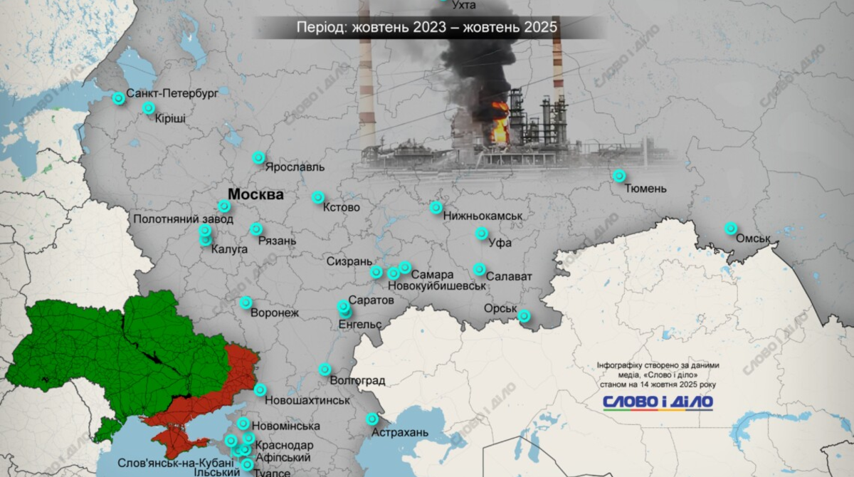 3 октября БПЛА поразили нефтеперерабатывающий завод «Орскнефтеоргсинтез» в Оренбургской области россии, 4 октября – НПЗ в Киришах, 6 октября – в Тюмени, а 11 октября дроны атаковали нефтеперерабатывающий завод «Башнефть-УНПЗ» в Уфе(Башкортостан).