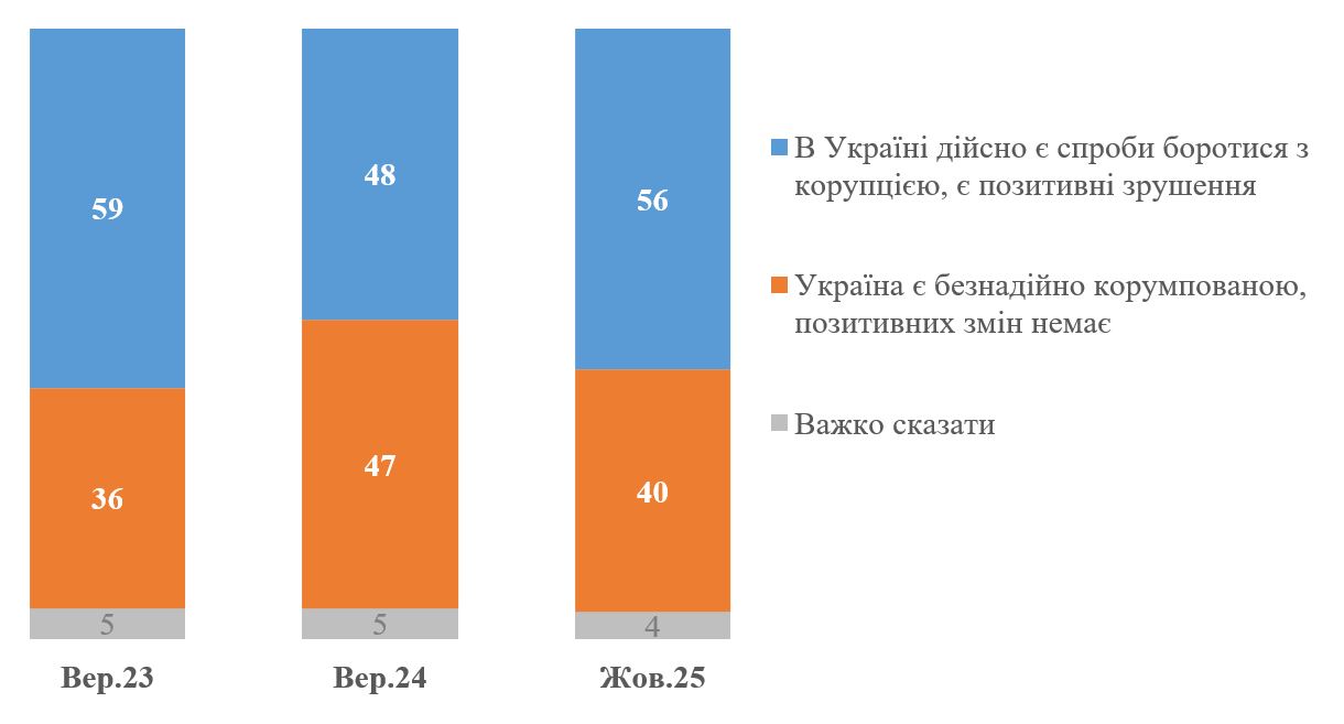 По данным КМИС, 56% респондентов считают, что в Украине действительно пытаются бороться с коррупцией, а 40% оценивают страну как «безнадёжно коррумпированную». По сравнению с 2024 годом оптимистов стало больше, а пессимистов меньше, хотя показатели всё ещё ниже уровня 2023 года.