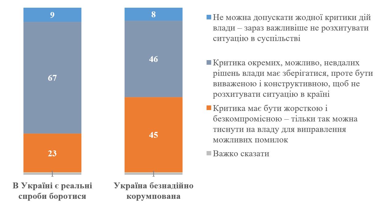 Что касается критики власти: лишь 8% украинцев считают, что её вообще нельзя критиковать. Остальные 90% согласны с тем, что критика необходима – из них 58% поддерживают конструктивную форму, а 32% – жёсткую и бескомпромиссную. Среди тех, кто считает страну безнадёжно коррумпированной, чаще поддерживается жёсткая критика, но даже в этой группе большинство склоняется к конструктивному подходу или вообще против критики.