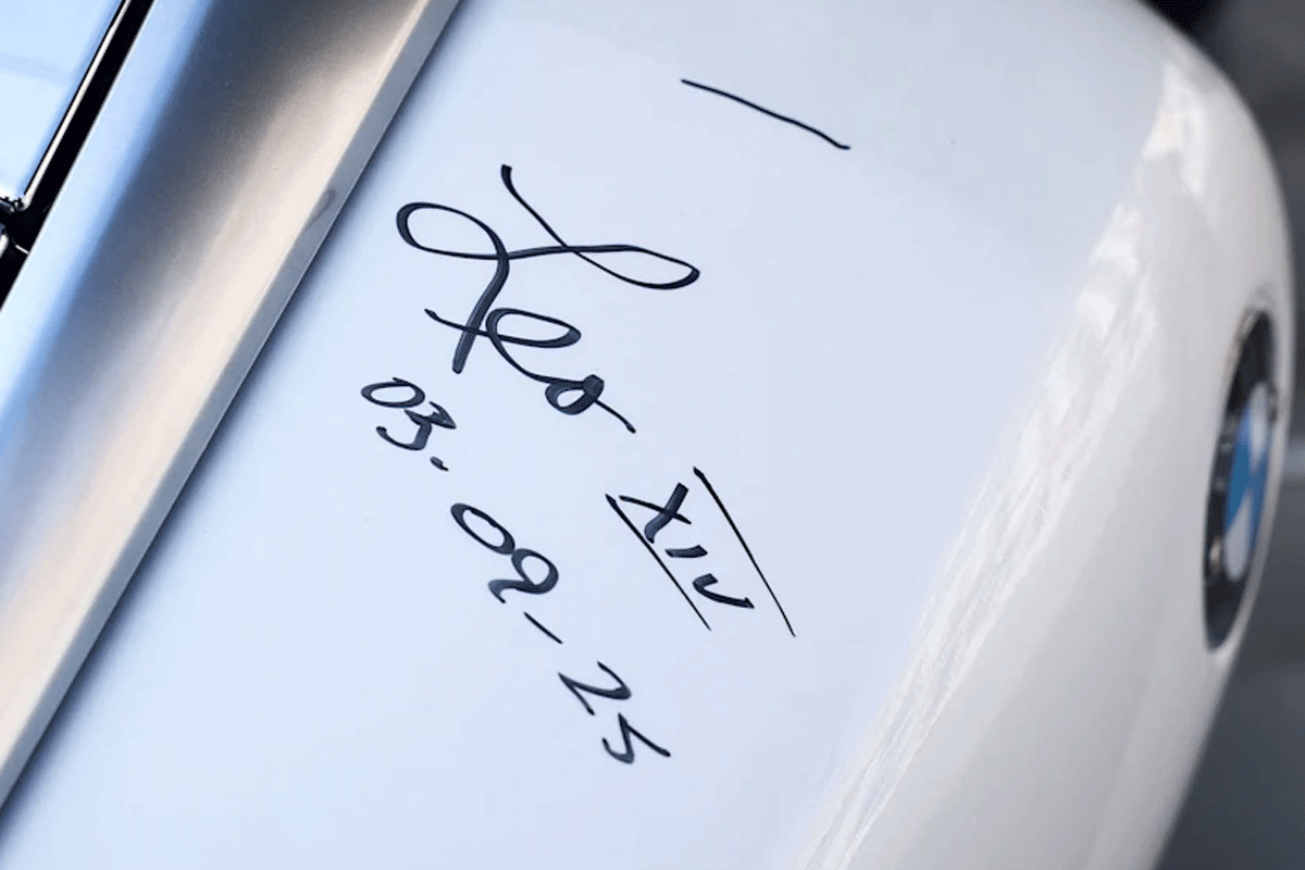 Белый BMW R 18 Transcontinental 2024 года выпуска был индивидуально изготовлен в баварской мастерской и украшен серебряной табличкой с именем Папы. Мотоцикл также украсили гербом Ватикана и именной подписью Льва XIV.