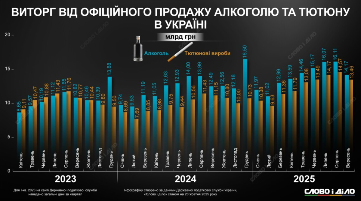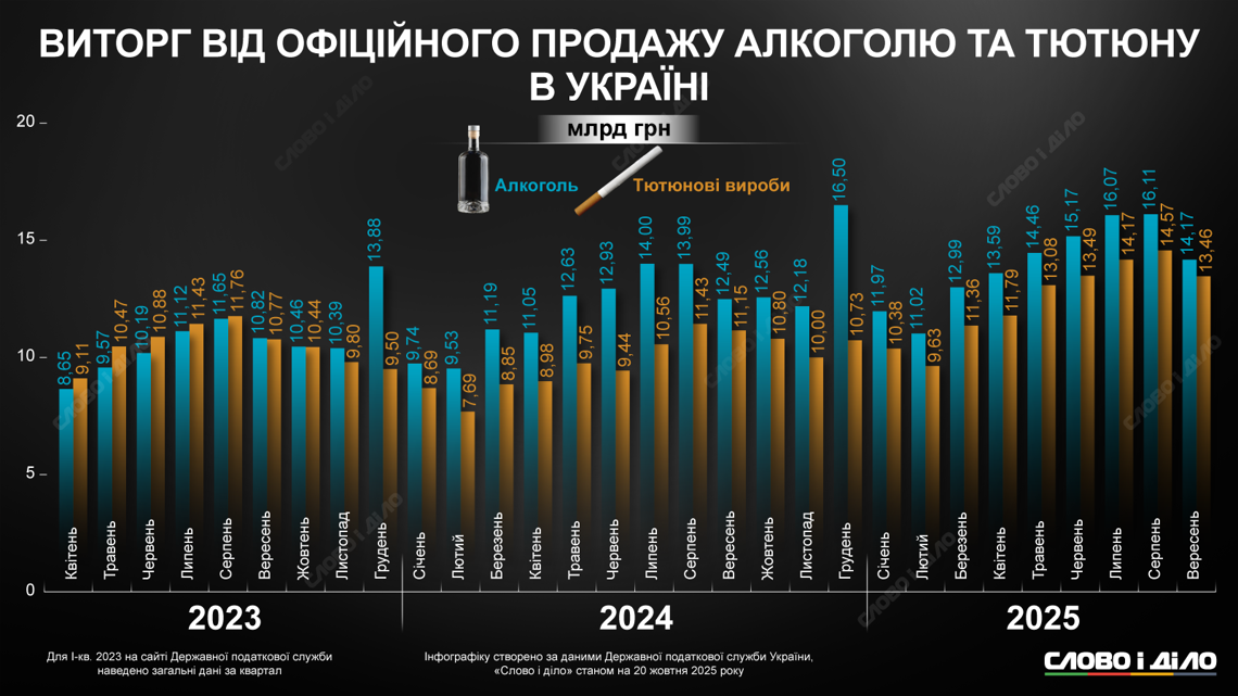 В сентябре 2025 года украинцы приобрели алкоголь на 14,17 млрд грн. В сентябре 2024-го было израсходовано на спиртное 12,49 млрд грн, в сентябре 2023-го – 10,82 млрд грн. Табачных изделий в прошлом месяце украинцы приобрели в официальных точках продаж на 13,46 млрд грн. В 2024-м – на 11,15 млрд грн, в 2023-м – 10,77 млрд грн.