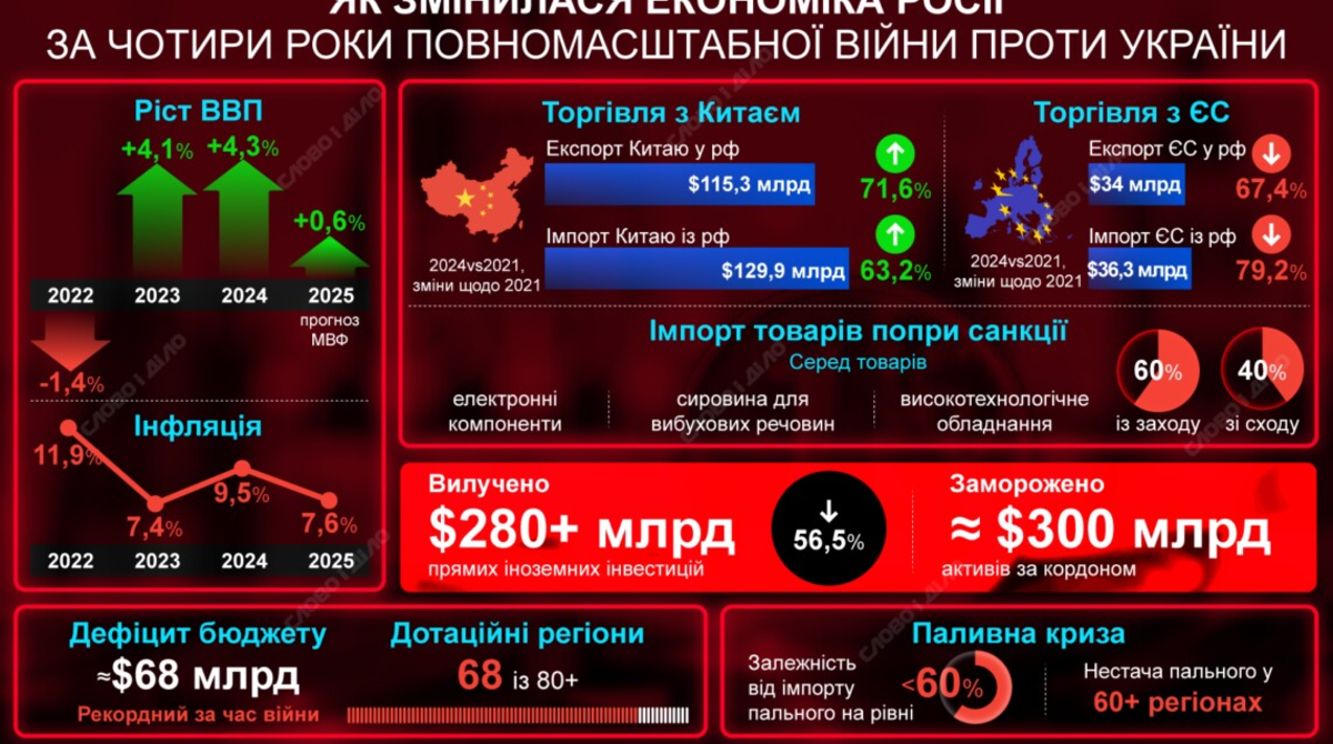 Российский диктатор владимир путин продолжает жертвовать стабильностью и перспективами развития государства ради кровопролитной войны против Украины. Рекордный дефицит бюджета, прогнозируемый рф в этом году, свидетельствует о том, что российская экономика, сохранявшая относительную устойчивость в 2022-м и 2023-м, сейчас почти не выдерживает огромных военных расходов. К тому же сотни миллиардов долларов активов рф все еще заморожены за рубежом. Существенно обостряет ситуацию топливный кризис на территории россии на фоне успешных атак Украины на НПЗ. Держаться на плаву экономике рф помогает торговля с Китаем, Индией, в меньшей степени с некоторыми странами ЕС, которые все еще покупают российские энергоносители. На инфографике «Слово и дело» – как изменилась ситуация в российской экономике на протяжении почти четырех лет вторжения в Украину.