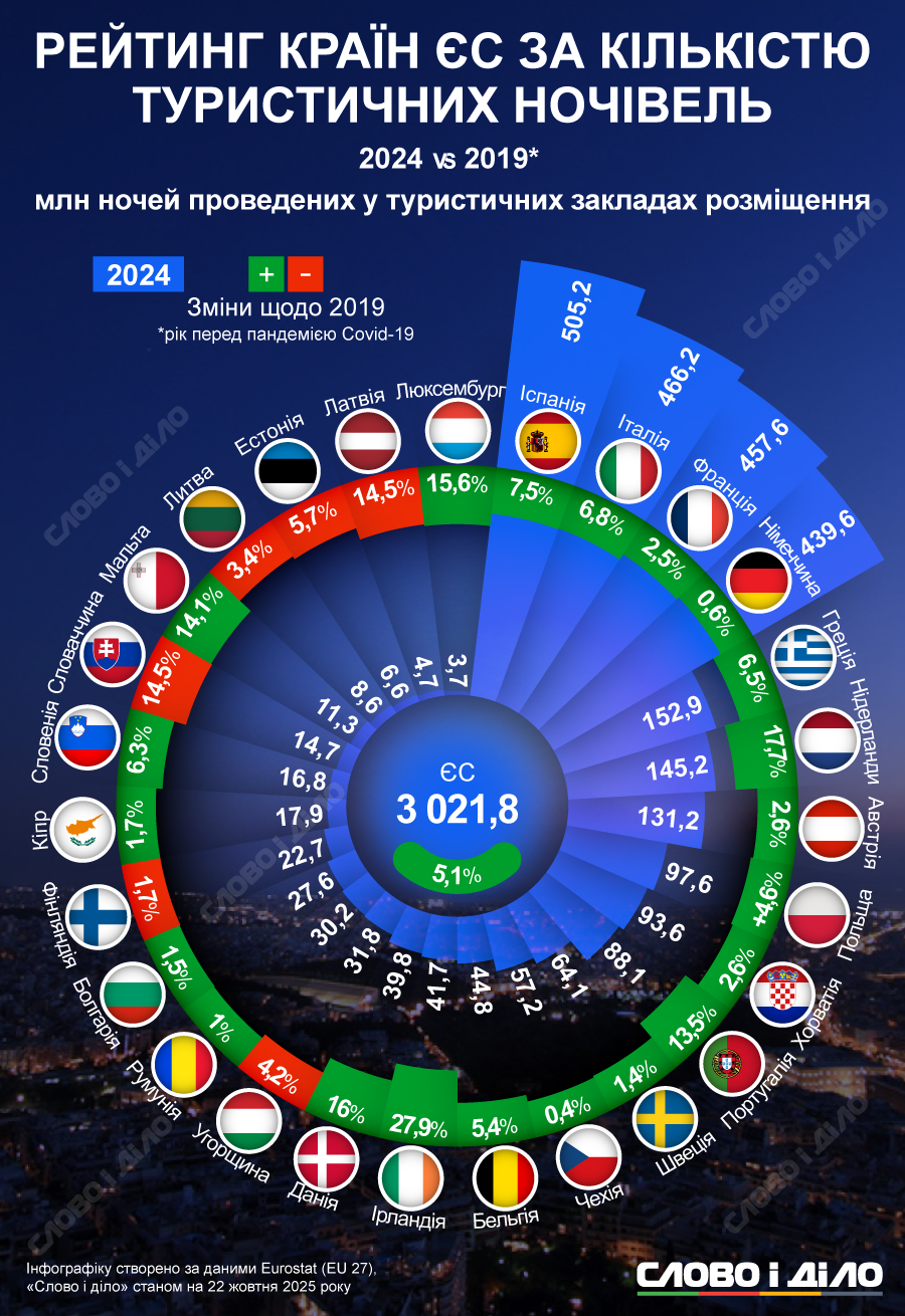 В туристических заведениях Польши путешественники в прошлом году провели 97,6 млн ночей (+4,6% к 2029 году). В Хорватии – 93,6 млн ночевок (+2,6% к 2019 году). Прирост ночевок туристов также демонстрирует и Португалия – более 88 млн в 2024 году (+13,5% к 2019 году).
