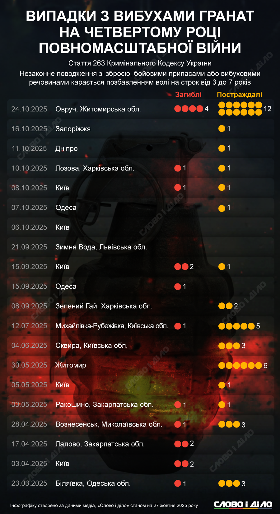 Трагедия с подрывом гранаты в поезде в городе Овруч Житомирской области, где погибли четыре человека и еще 12 пострадали, к сожалению, далеко не единственная за этот год. Полномасштабная война, несмотря на убийства россиянами гражданских и гибель украинских военных на фронте, добавила в повседневную жизнь украинцев еще одну опасность – почти неконтролируемое распространение взрывоопасных веществ, в частности, боевых гранат. Где еще в Украине в 2025 году были случаи с подрывом гранат, сколько людей погибло и пострадало – на инфографике «Слово и дело».