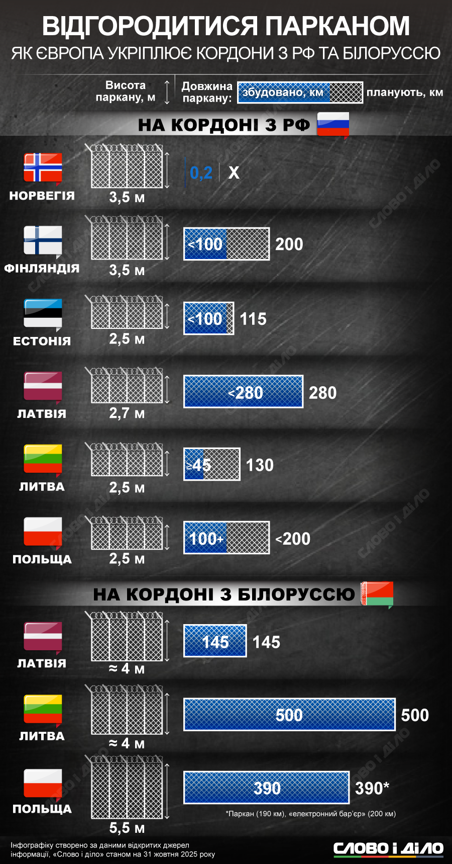 Литва на месяц решила закрыть границу с Беларусью в ответ на инциденты с контрабандными метеозондами. Запрет будет действовать до 30 ноября с возможностью продления. Другие европейские страны, учитывая ситуацию с военными учениями, мигрантами, а с недавних пор – неизвестными дронами, построили или продолжают строить заборы на границе с рф и Беларусью. Отгородиться от россии в свое время решили Польша, Литва, Латвия, Эстония, а затем Финляндия и Норвегия. Сдерживающий барьер на границе с Белорусью уже построили Литва, Латвия и Польша. Как именно европейские страны отгораживаются от потенциально опасных соседей – на инфографике «Слово и дело».