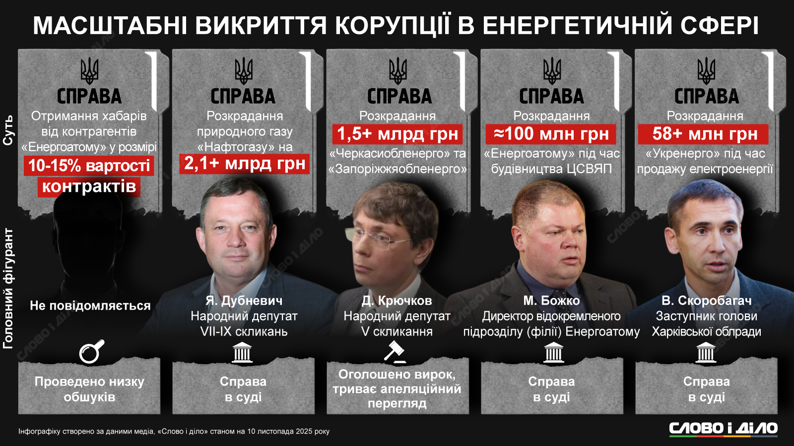 НАБУ и САП сообщили о разоблачении масштабной схемы взяток на государственном предприятии «Энергоатом», к которой причастны чиновники и связанные с ними лица. Разоблачению предшествовали обыски у бизнесмена и совладельца студии «Квартал 95», соратника президента Владимира Зеленского Тимура Миндича, а также Германа Галущенко, ранее возглавлявшего Минэнерго. Это далеко не первый эпизод коррупции в украинской энергетике, который был обнаружен во время войны в Украине – на фоне постоянных атак на уже поврежденную энергетическую инфраструктуру. «Слово и дело» решило вспомнить, какие еще случаи разоблачения коррупции в сфере энергетики обнаружили НАБУ и САП, кто был фигурантами дел и на какой стадии расследование.