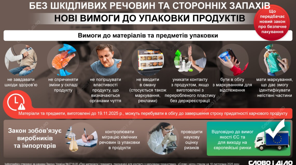 С 19 ноября в Украине вступит в силу новый закон о безопасной упаковке. Он является одним из ключевых шагов на пути евроинтеграции в сфере безопасности пищевых продуктов. Отечественная продукция получит возможность отвечать требованиям качества ЕС и выходить на европейские рынки. Закон, в частности, устанавливает единые правила для всех материалов, контактирующих с едой – от упаковки и посуды, тары, крышек до производственного оборудования. Подробнее о новом законе о безопасной упаковке по стандартам ЕС – на инфографике «Слово и дело».