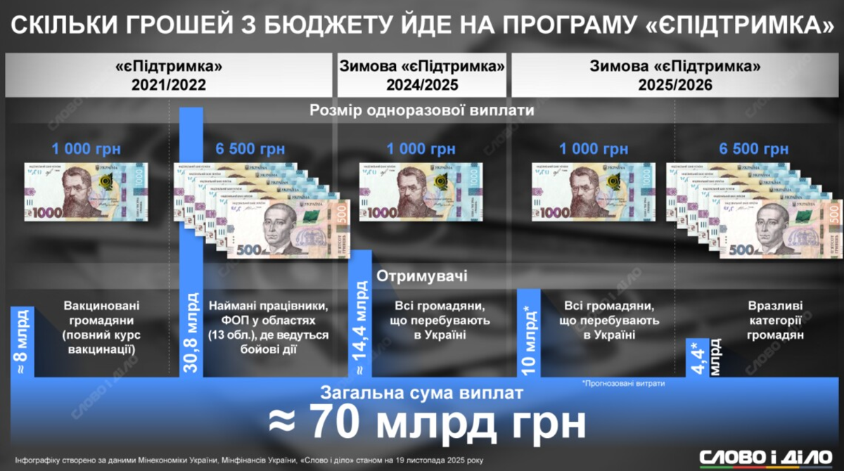Таким образом, всего за пять лет на программу «еПоддержка» из госбюджета направили около 70 млрд грн, из которых 14,4 млрд – это прогнозируемые расходы на зимнюю «еПоддержку» 2025/2026.