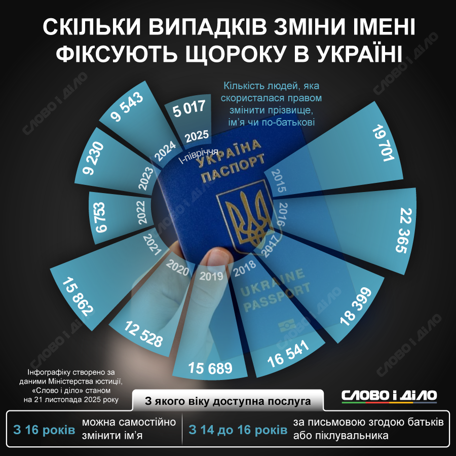 По данным Министерства юстиции, в 2015 году услугой смены имени воспользовались 19 701 гражданин Украины. Рекордное количество случаев смены имени зафиксировали в 2016 году – 22 365. Высоким спрос на эту услугу оставался и в 2017 и 2018 годах: 18 399 и 16 541 соответственно. Несколько реже украинцы меняли свои имена с 2019 по 2021 год – более 15 тысяч случаев в год.