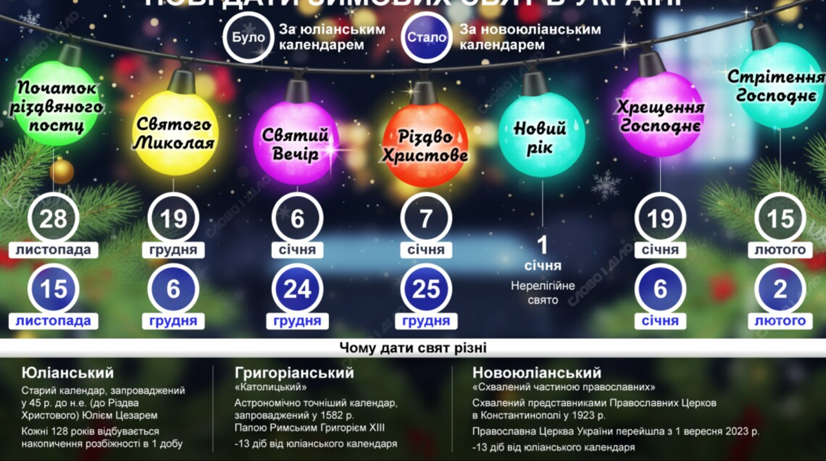 Уже через неделю, 6 декабря, православные украинцы в третий раз будут отмечать День Святого Николая по новоюлианскому календарю. Новая дата совпадает с днем празднования католиков и других христиан. До этого Святого Николая почитали 19 декабря – по юлианскому календарю. Святой вечер и Рождество украинцы будут отмечать также в декабре – вместе со всей Европой. Неизменной остается дата Нового года, поскольку это светский, а не церковный праздник. В то же время Крещение и Сретение Господне ПЦУ чтит по новому стилю. Подробнее о новых датах зимних праздников 2025-2026 – на инфографике «Слово и дело».