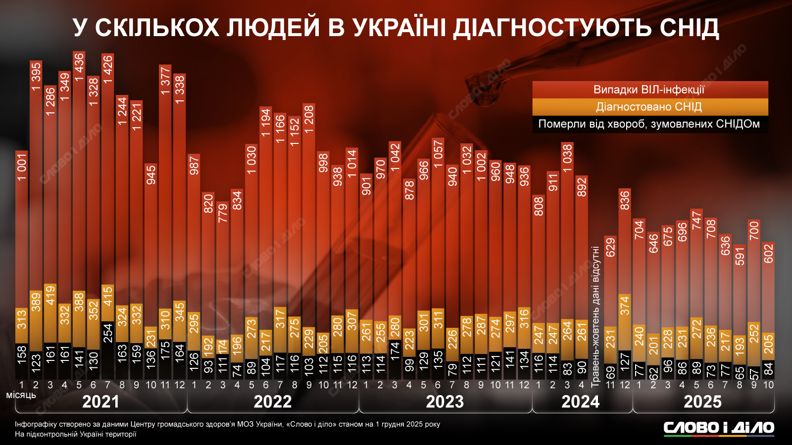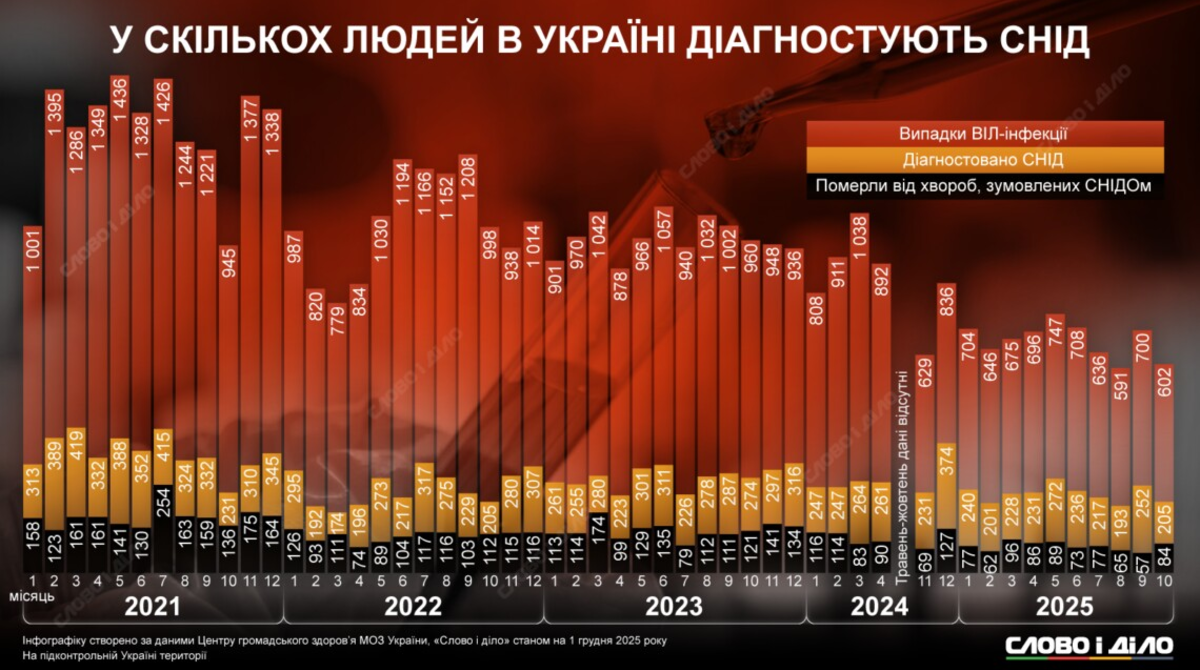 За первые десять месяцев текущего года в Украине зафиксировали более 6700 случаев ВИЧ-инфекции, у 2275 человек был диагностирован СПИД, умерли от болезней, вызванных СПИДом, 766 человек. Впрочем, это лишь официальные данные Центра общественного здоровья МОЗ, касающиеся подконтрольных Киеву территорий, реальная цифра может быть выше. Проблема остается острой, несмотря на смещение фокуса внимания на тему войны или довоенной пандемии. К тому же, не все случаи инфицирования попадают в отчеты. Во Всемирный день борьбы со СПИДом, 1 декабря, «Слово и дело» публикует статистику о количестве случаев инфицирования ВИЧ, диагностики СПИДа и смертей от этой инфекции с 2021 по 2025 год.