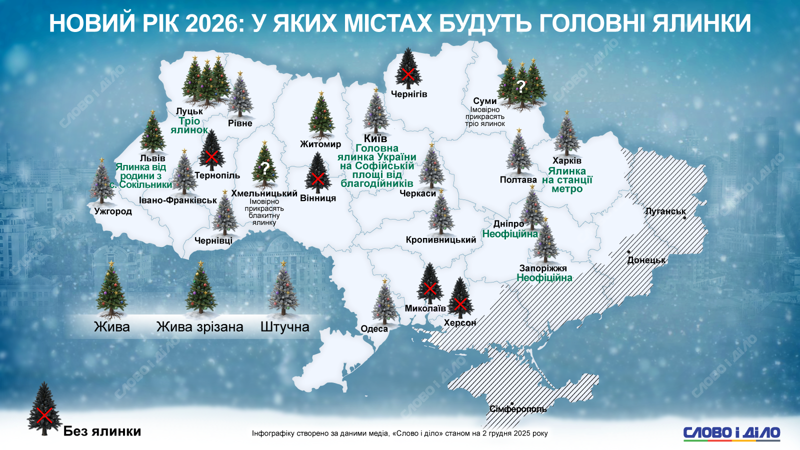 На этой неделе в Киеве на Софийской площади зажгут главную елку страны. Открытие праздничной локации уже традиционно состоится в День Святого Николая – 6 декабря. Средства на украшения, как и в предыдущие годы, предоставили меценаты. Несмотря на сложности военного времени, установить новогоднюю елку в этом году решили большинство областных центров, предпочитая искусственное дерево. В то же время Тернополь, Чернигов и еще некоторые города решили не украшать рождественские символы. На инфографике «Слово и дело» – в каких крупнейших городах Украины будут встречать Новый год-2026 с главной елкой, а где от нее отказались.