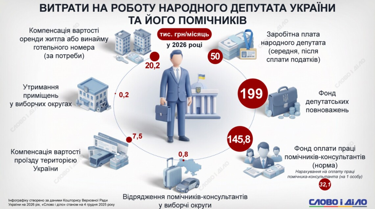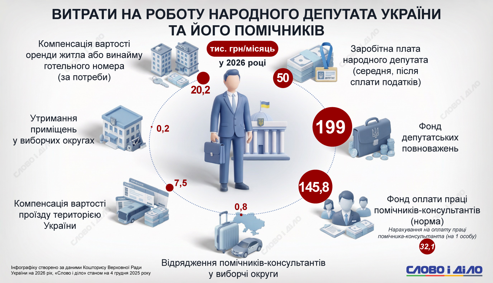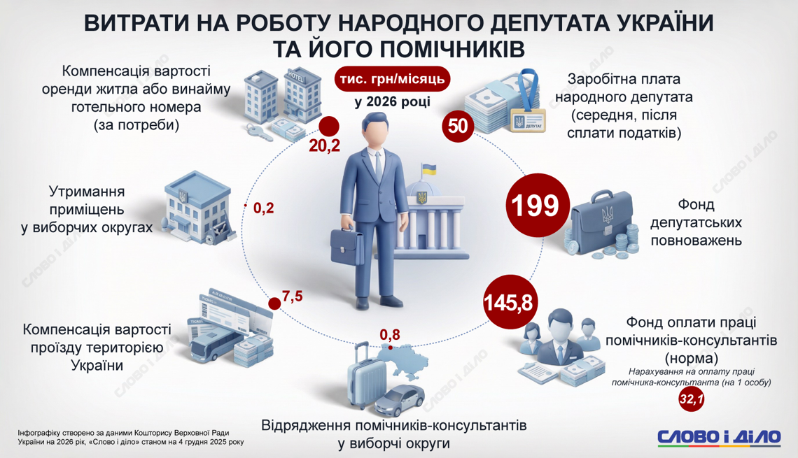 То есть, в 2026 году, кроме повышенной зарплаты, ежемесячно парламентарии будут получать на депутатскую деятельность еще около 200 тысяч гривен. Таким образом, в целом на работу одного народного избранника из бюджета ежемесячно будут тратить примерно 250 тысяч гривен, не учитывая фонд для помощников и компенсацию на проживание.