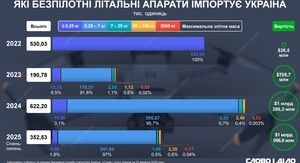 Сколько и каких беспилотников импортирует УкраинаУкраина в этом году импортировала больше всего дронов, имеющих максимальную взлетную массу до 7 кг, среди которых и мультикоптеры для съемки видео. Подробнее об импорте БПЛА с 2022 года – на инфографике.