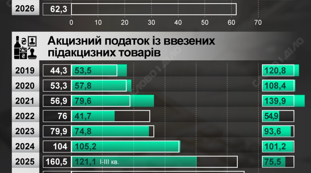 В 2026 году правительство рассчитывает получить 683,6 млрд гривен за счет НДС по ввозимым товарам, 62,3 млрд от ввозной пошлины, а также 167,2 млрд грн от акцизного налога по ввезенным подакцизным товарам. То есть, по плану поступления должны увеличиться во всех трех категориях по сравнению с текущим годом.