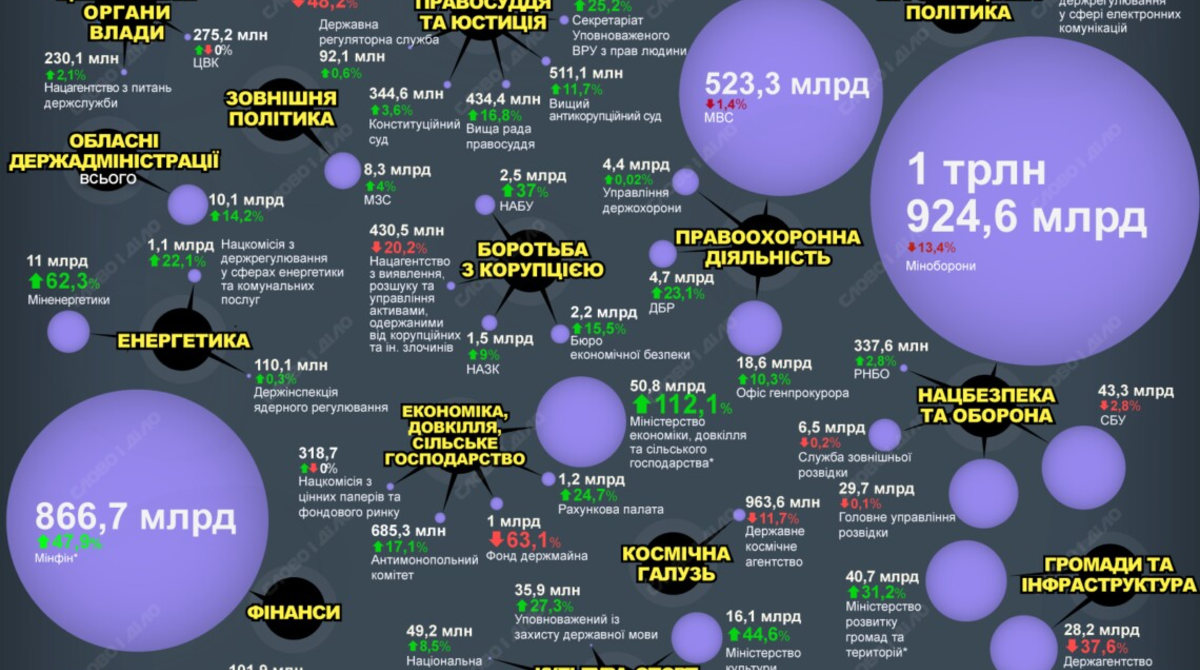 В государственном бюджете на следующий год, который на днях подписал президент Владимир Зеленский, общий объем расходов составляет почти 4,8 трлн грн. Также в документе – рекордный дефицит, почти 19%. Несмотря на это, в 2026 году вырастет минимальная зарплата и прожиточный минимум, повысят зарплаты учителей и увеличат выплаты при рождении ребенка. Также по сравнению с текущим годом возрастут расходы на Верховную раду, Секретариат Кабмина, ВСП. Больше денег в 2026 году получат и ряд министерств – МОН, МОЗ, Минэкономики, Минэнерго, Минкультуры, Минцифры, Минветеранов и ГБР. «Слово и дело» проанализировало главный финансовый документ страны и предлагает посмотреть, как изменятся расходы государства в 2026 году по сравнению с текущим годом.