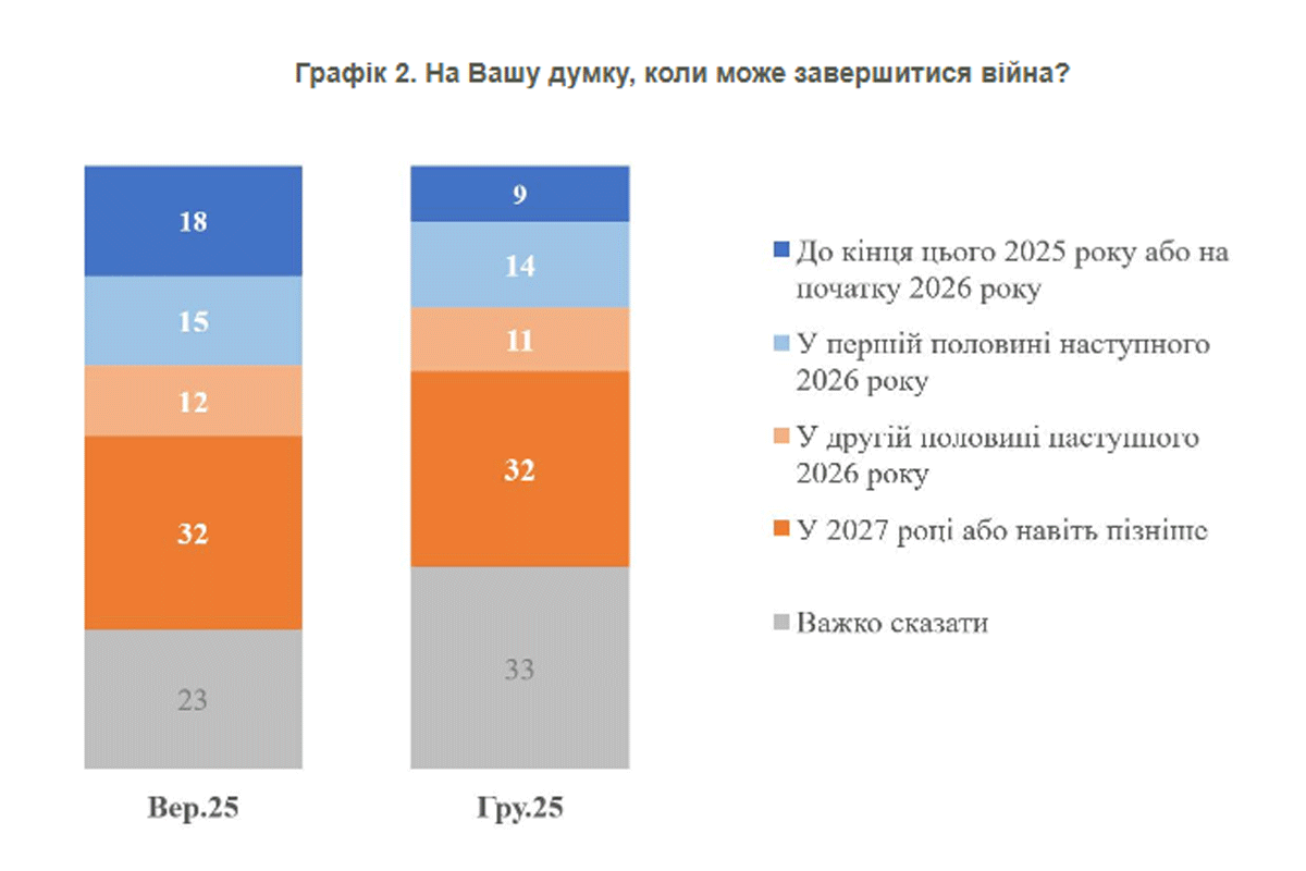 Социологи также выяснили, что только 9% украинцев ожидают, что война завершится до начала 2026 года (в сентябре было 18%) и лишь 14% ожидают завершения хотя бы в первой половине 2026 года (в сентябре было 15%). Вместо этого 11% говорят о второй половине 2026 года (было 12%), 32% – о 2027 году и позже (было столько же).
