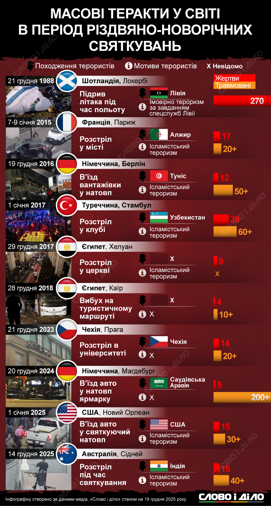 Новогодние и рождественские празднования 2025-2026 только начинаются, а в некоторых странах мира уже произошли кровопролитные теракты, в результате которых погибли или получили ранения десятки человек. Самым громким с начала декабря стал антисемитский теракт на пляже Бонди в Сиднее: двое террористов открыли по людям огонь во время празднования Хануки. Погибли 16 человек, в том числе один из нападавших. Также среди жертв – 10-летний ребенок. Еще в этом месяце в немецкой Баварии арестовали подозреваемых в планировании теракта на рождественской ярмарке. А в Соединенных Штатах произошла стрельба в Браунском университете и студенческом общежитии штата Кентукки. «Слово и дело» на инфографике вспомнило и другие случаи совершения терактов в период рождественско-новогодних празднований в странах мира.