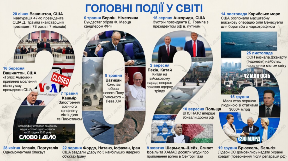 Одно из важных событий, в частности для Украины и ее возможностей продолжать оборону против рф, произошло в конце года – лидеры стран ЕС в Брюсселе согласились предоставить кредит в 90 млрд евро. Киев сможет вернуть эти деньги уже после того, как россия выплатит репарации. Какими еще важными событиями на мировом уровне отличился 2025 год – можно вспомнить на инфографике «Слово и дело».