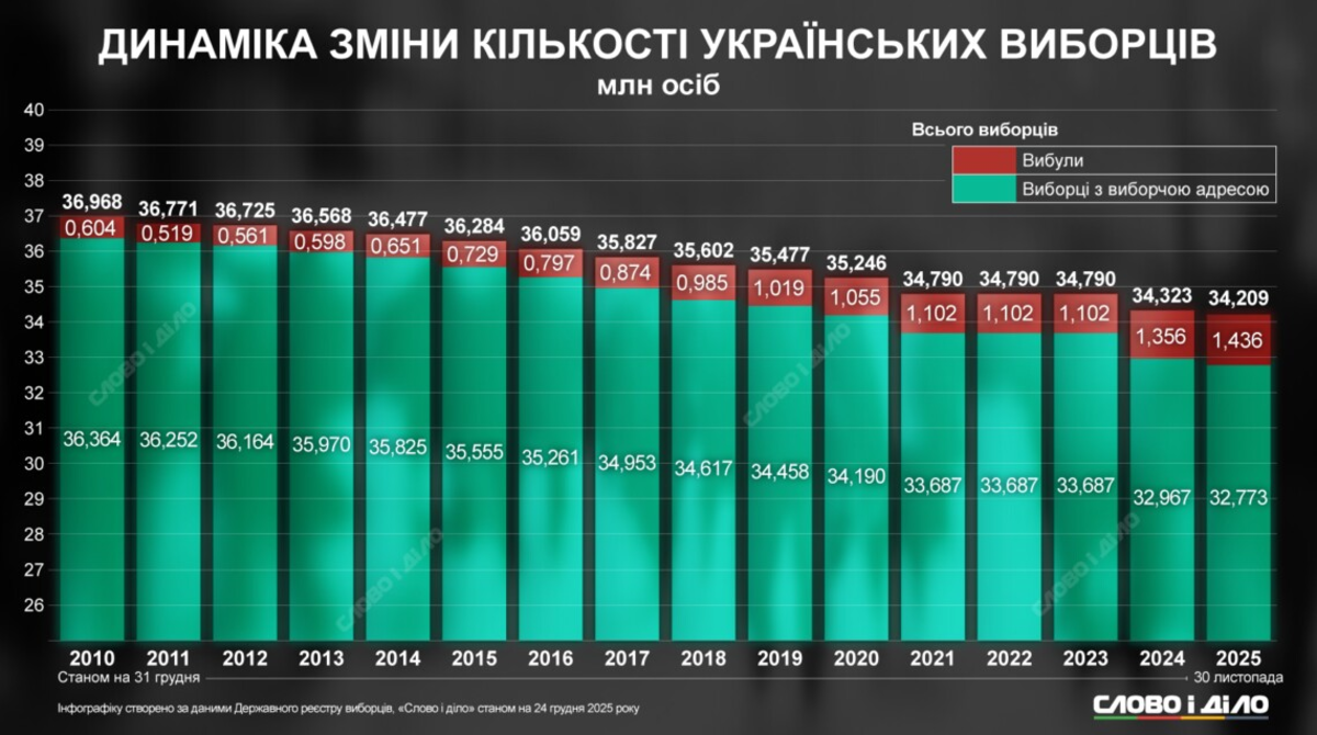 По состоянию на конец ноября 2025 года в Госреестре избирателей числится 34 млн 209 тыс. человек. Избирателей с избирательным адресом – 32 млн 773 тысяч. Но вышеуказанное количество граждан – это не та цифра, которая будет отражена в окончательных списках избирателей во время возможных президентских выборов в Украине, данные будут обновлять и верифицировать.
