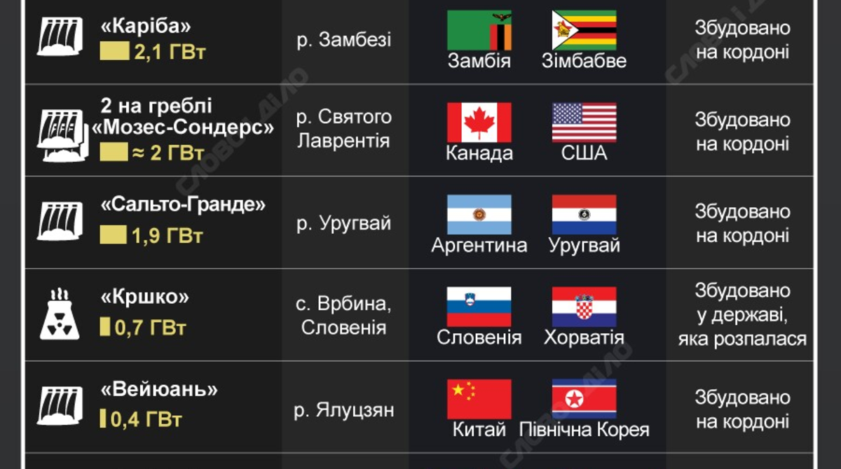 Так, Бразилия и Парагвай совместно управляют ГЭС «Итайпу», построенной на реке Парана и имеющая мощность 14 ГВт. Еще одной ГЭС «Ясирета» (мощность 3,2 ГВт), также стоящей на реке Парана, управляют Аргентина и Парагвай. Румыния и Сербия осуществляют управление ГЭС «Джердап» (мощность около 2,6 ГВт), она построена на реке Дунай. Замбия и Зимбабве имеют совместное управление ГЭС «Кариба», мощность которой 2,1 ГВт. Эта ГЭС построена на реке Замбези.