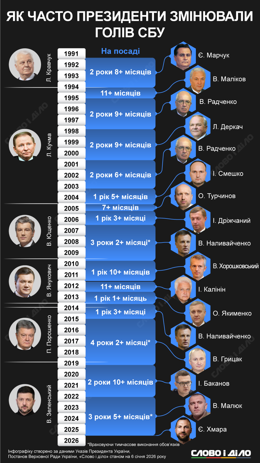 Такой же срок после Радченко (апрель 1998-февраль 2001) в должности главы СБУ провел Леонид Деркач. Однако после Деркача Радченко снова назначили главой ведомства, во время второго срока он проработал еще два года и шесть месяцев – до сентября 2003 года.