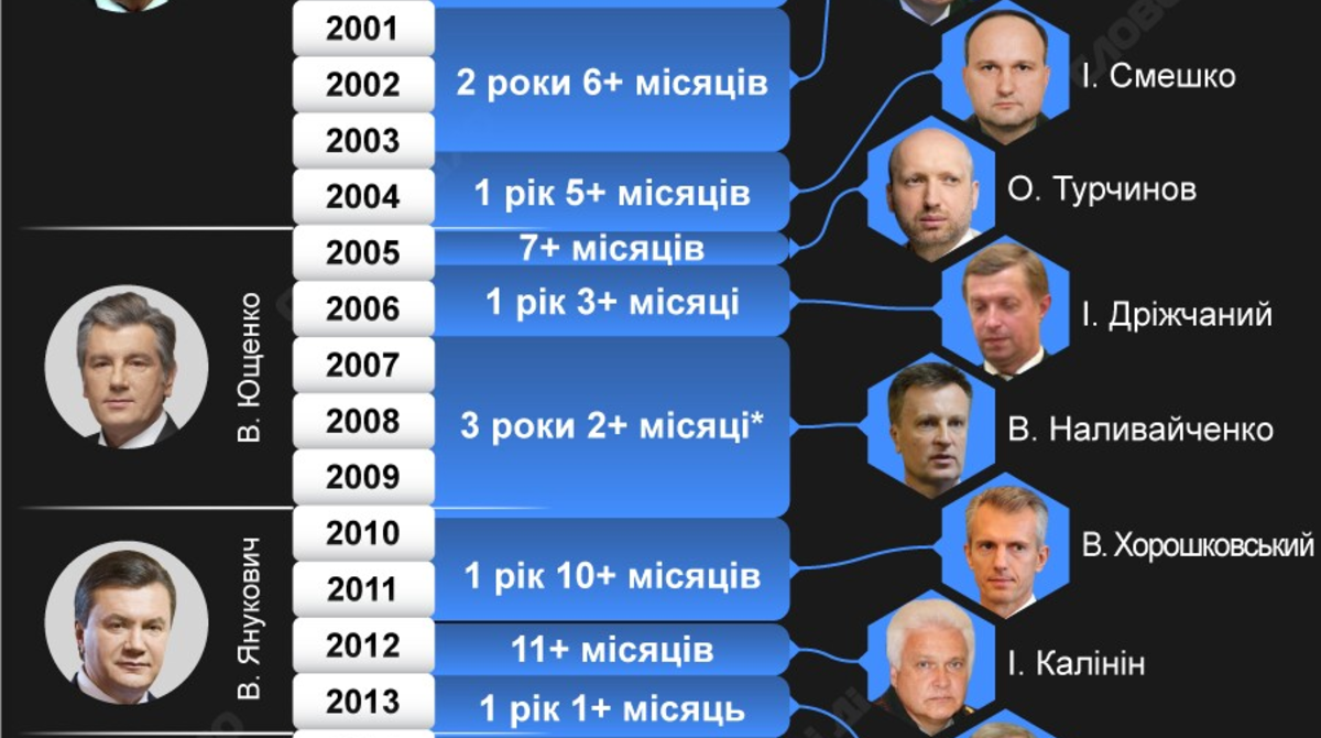 Всего 7 месяцев руководил Службой безопасности Александр Турчинов (с февраля по сентябрь 2005 года). Это самый маленький срок среди всех глав ведомства.