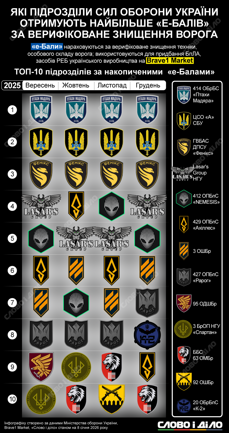 Четыре месяца подряд удерживают абсолютное лидерство по количеству накопленных «е-Баллов» бойцы 414 отдельной бригады ударных беспилотных систем ВСУ «Птицы Мадяра». Также в первую тройку наиболее эффективных подразделений по уничтожению вражеских целей дронами вошли центр спецопераций «А» СБУ и отдел беспилотных авиационных систем «Феникс», являющийся подразделением ГПСУ. На инфографике «Слово и дело» – ТОП-10 подразделений по накопленным боевым баллам за верифицированное уничтожение врага и его техники с сентября по декабрь 2025 года.
