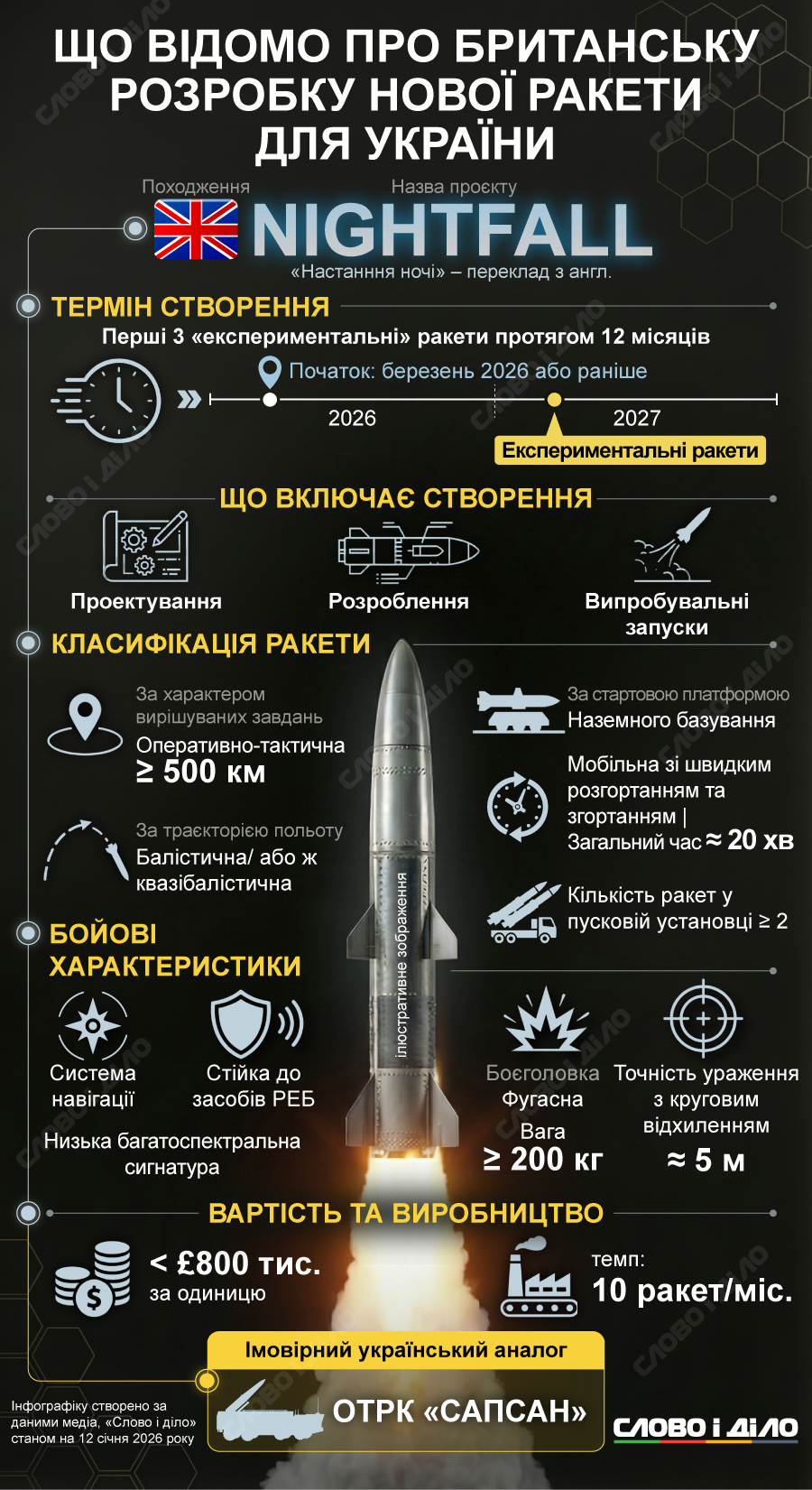 Планы разработать и передать Украине баллистические ракеты Nightfall («наступление ночи» – с англ.) подтвердил министр обороны Британии Джон Гили во время визита в Киев 9 января этого года. Он отметил, что Украина должна иметь возможность не только защищаться от российских атак, но и бить в ответ, в том числе – и на большие расстояния.