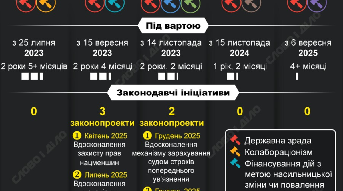У Евгения Шевченко сразу два подозрения в государственной измене и одно в мошенничестве. Первую он получил в ноябре 2024 года, а в июле 2025 года его обвинили в мошенничестве в особо крупных размерах. Под стражей нардеп 1 год и 2 месяца. От него также не поступало никаких законодательных инициатив.