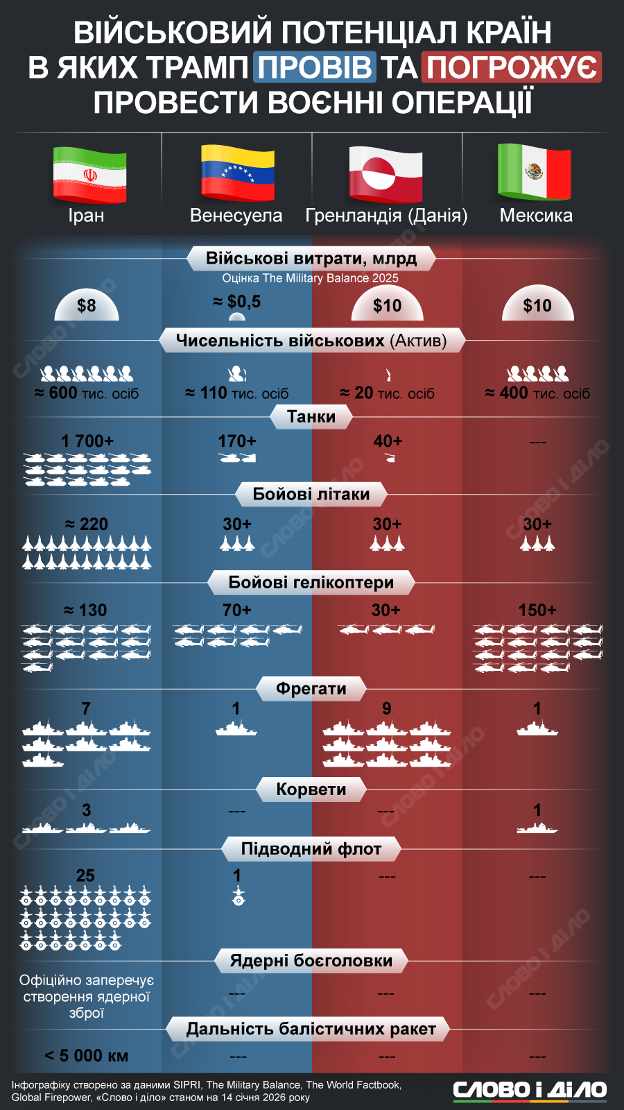 Четыре страны находятся на пороге возможного вмешательства войск США на фоне угроз главы Белого дома Дональда Трампа. После военной операции в Венесуэле США открыто говорят о том, что могут вмешаться в ситуацию с протестами в Иране, аналитики уже спрогнозировали четыре возможных сценария. Еще одной горячей темой начала года остается Гренландия и активный интерес Трампа к ней. В Конгресс США даже внесли законопроект об «аннексии Гренландии», а сами Штаты не исключали и силового захвата. Под угрозой нового конфликта оказались и Мексика: по словам Трампа, Штаты вскоре могут приступить к наземным ударам против мексиканских картелей. «Слово и дело» проанализировало, какой военный потенциал имеют страны, где США уже провели вооруженные спецоперации, а также государства под угрозой военного вмешательства.