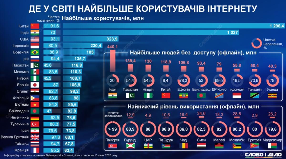 Без доступа к интернету наибольшее количество граждан проживает в Индии, Пакистане, Нигерии, Китае, Эфиопии, Бангладеш, ДР Конго, Индонезии, Танзании, Уганде.