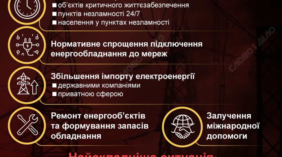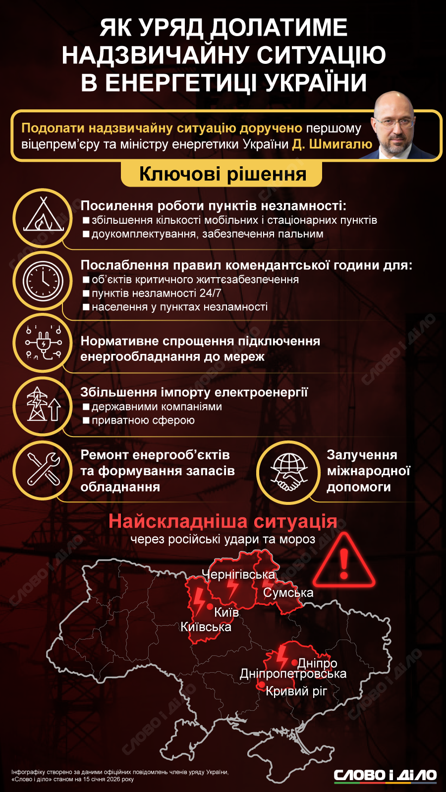 Украинская энергетика оказалась в состоянии чрезвычайной ситуации из-за массированных российских атак и усиления морозов. Ответственным за разрешение ситуации президент определил только что назначенного главу Минэнерго Дениса Шмыгаля. В Киеве, где без тепла все еще около трехсот многоэтажек, с сегодняшнего дня заработал координационный штаб для ликвидации последствий. Также власти анонсировали локальное ослабление комендантского часа, усиление работы пунктов несокрушимости и увеличение импорта электроэнергии. Подробнее о преодолении последствий кризисной ситуации в энергетике – на инфографике.