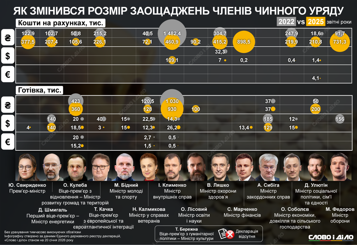 Для анализа мы взяли данные 2022-2025 годов (по году подачи деклараций). Глава Кабинета министров Юлия Свириденко указала, что держит на личных счетах в банках 377,5 тысячи гривен, наличными – 4 тысячи долларов.