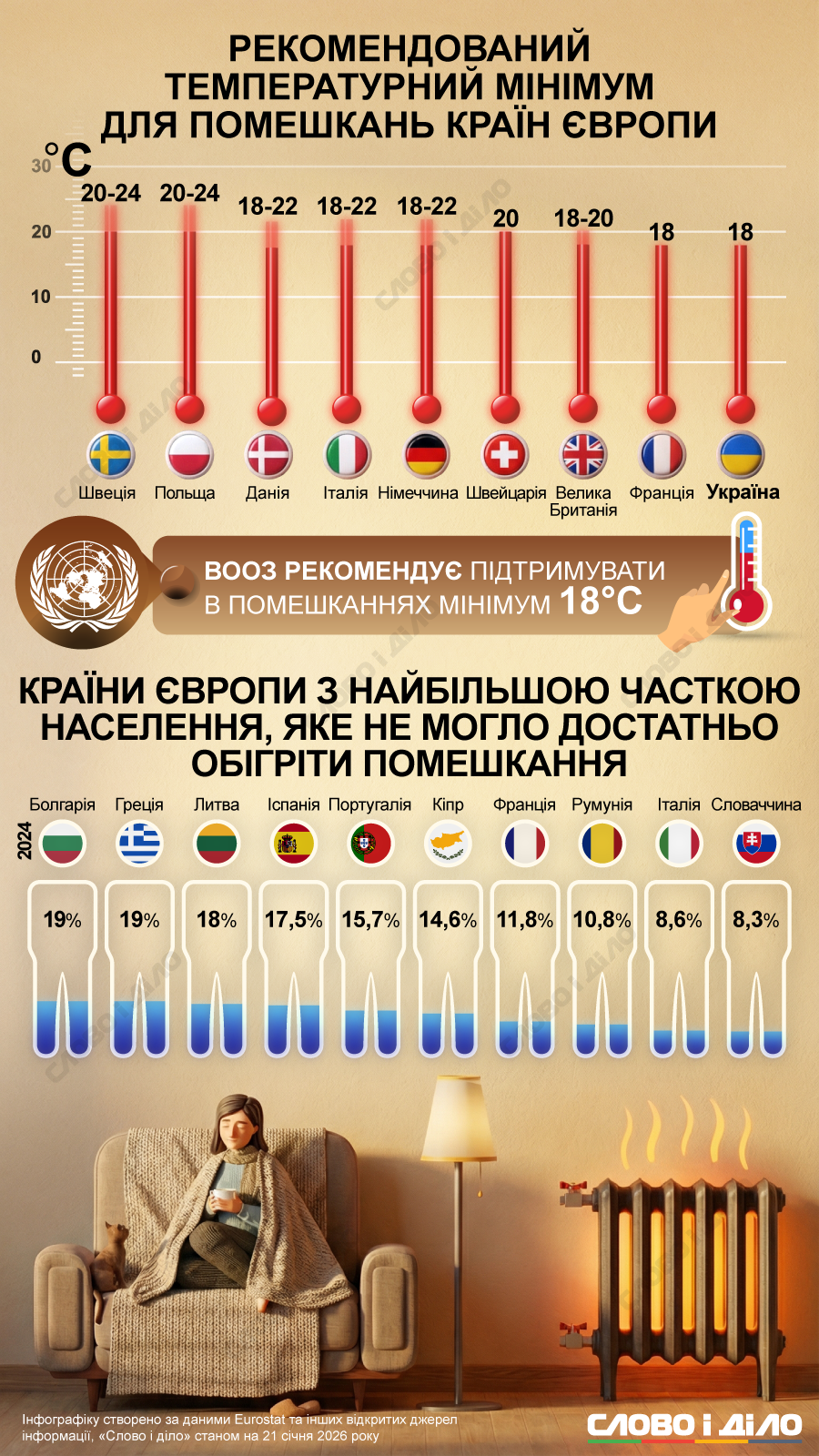 ВОЗ рекомендует поддерживать в помещениях минимум 18°C. Этой рекомендации, в основном, советует придерживаться власть в Украине и во Франции.