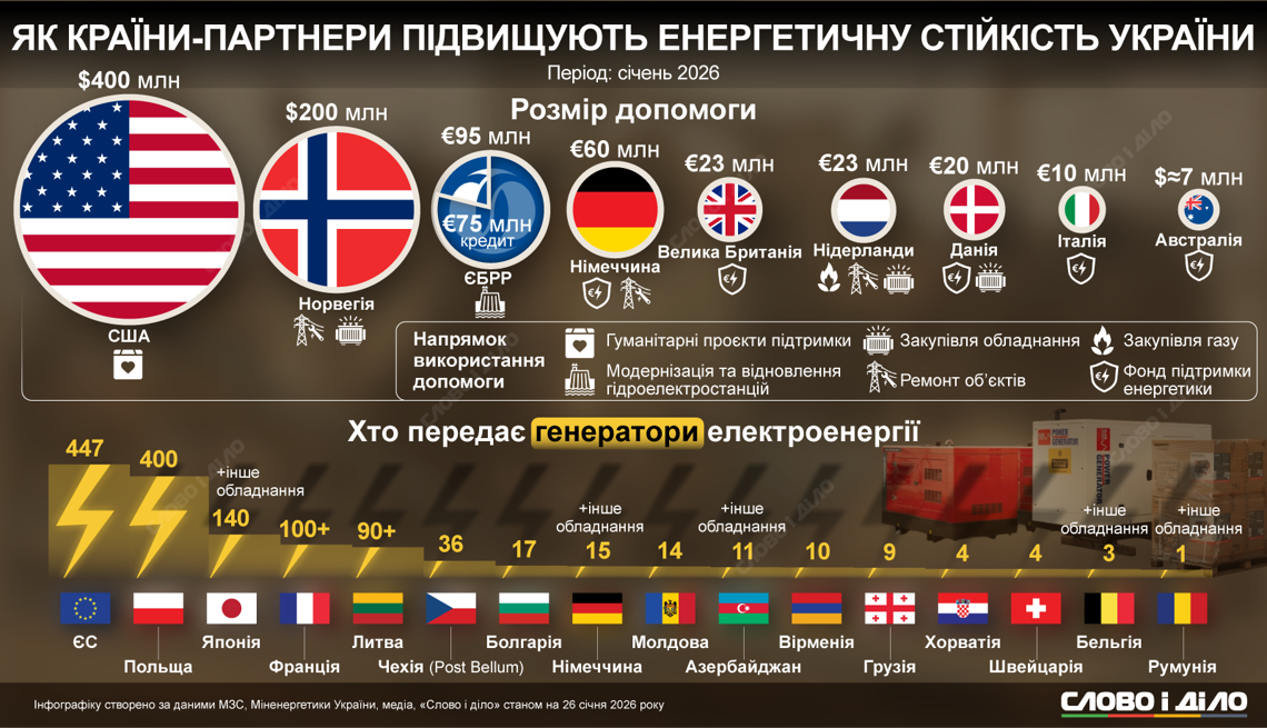 На сегодня известно, что союзники передали Украине уже более 1300 генераторов, больше всего – ЕС (447) и соседняя Польша (400). Еще 140 генераторов отправила Япония, более 100 – Франция, более 90 – Литва, 36 – Чехия, 17 – Болгария, 15 – Германия, 14 – Молдова, 11 – Азербайджан, 10 – Армения, 9 – Грузия. По четыре генератора Украина получила от Швейцарии и Хорватии, 3 – от Бельгии, 1 – от Румынии.