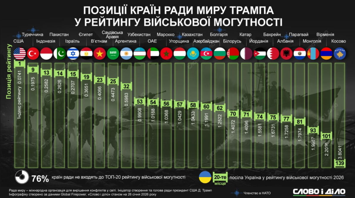 На первом месте – США, также являющиеся членами НАТО. На прошлой неделе глава Белого дома Дональд Трамп объявил о создании «Совета мира», членами которого сейчас, кроме самих Штатов, являются 24 страны. При этом 76% государств Совета не входят в ТОП-20 рейтинга военной мощи.