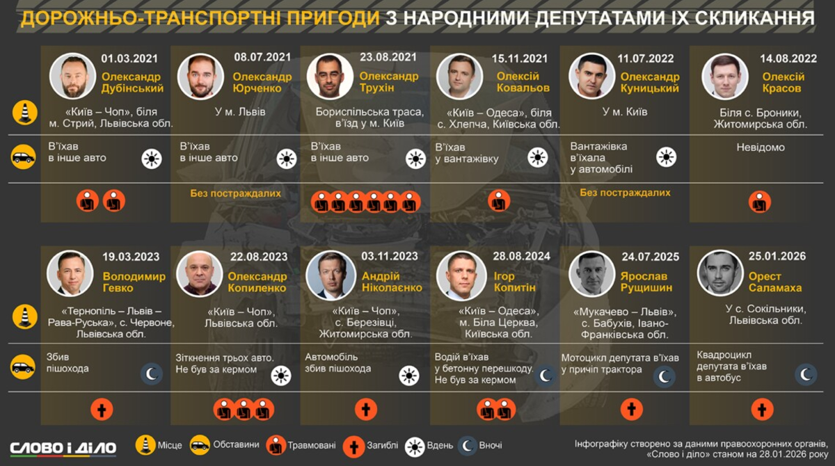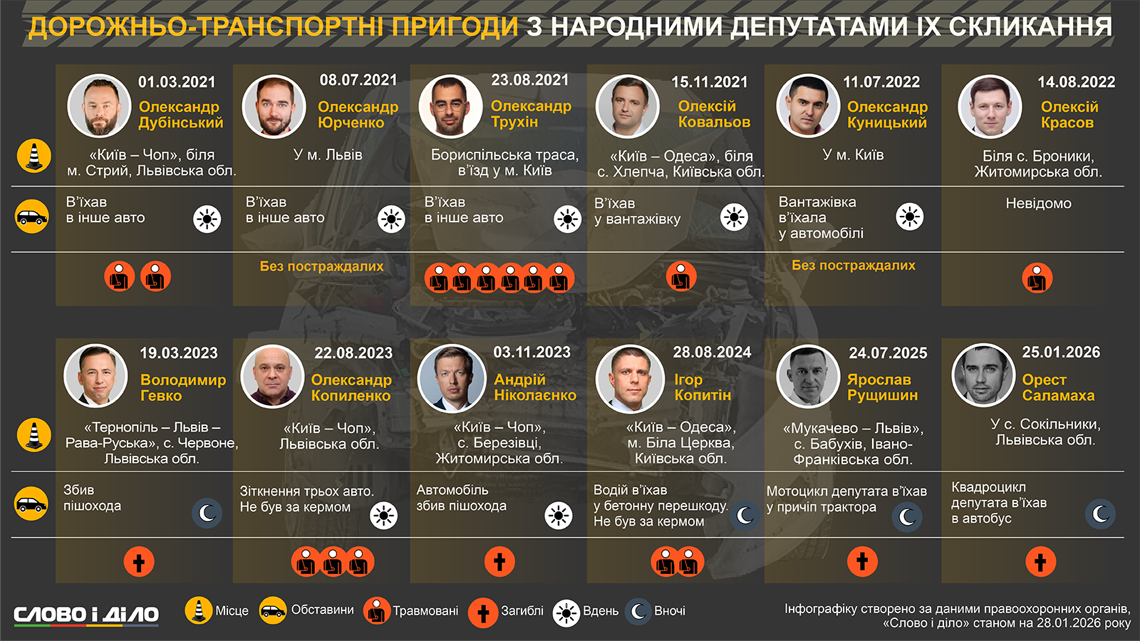 За последние пять лет произошло по меньшей мере 12 ДТП, участниками которых были народные депутаты IX созыва. Некоторые из аварий были смертельными. В частности, трагически начался текущий год, нардеп от «Слуги народа» Орест Саламаха погиб в ДТП во Львовской области. Подробнее о дорожно-транспортных происшествиях с участием народных избранников с 2021 по 2026 год – на инфографике.