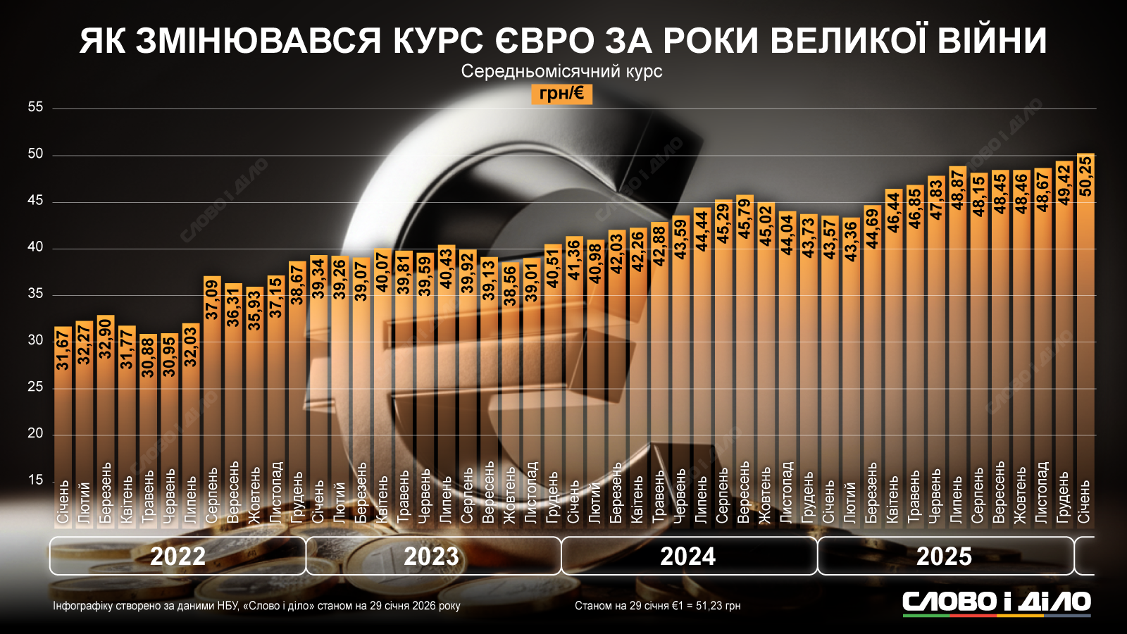 В этом месяце курс евро обновил исторический максимум в Украине, по состоянию на 29 января он остановился на отметке 51,23 грн/евро. В целом с начала полномасштабной войны и до сегодня евро подорожал более чем в полтора раза – больше, чем доллар. На инфографике – как менялся среднемесячный курс евро с 2022 по 2026 год.